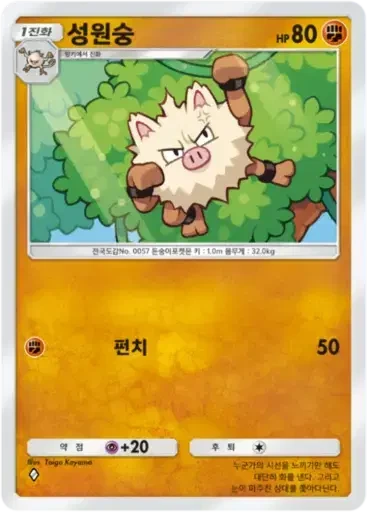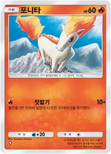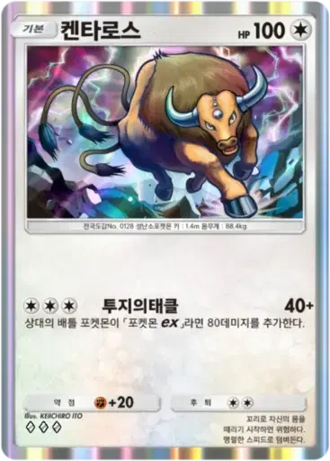 켄타로스 | ⬜⬜⬜ 투지의태클 (40+) ※ 추가 효과: 상대의 배틀 포켓몬이 ex라면 80데미지를 추가한다. |