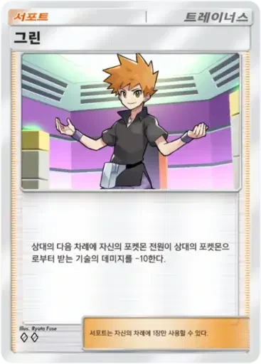 그린 | 상대의 다음 차례에 자신의 포켓몬 전원이 상대의 포켓몬으로부터 받는 기술의 데미지를 -10한다. |