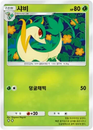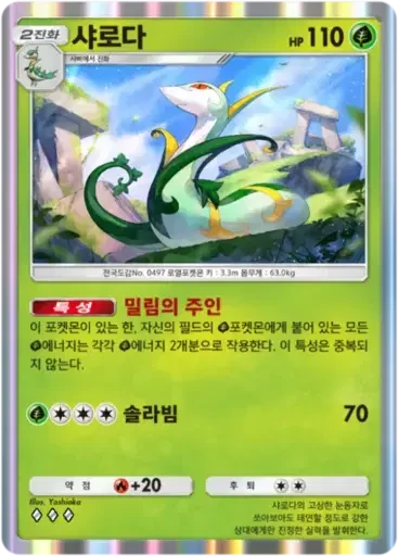 샤로다 | 특성: 밀림의 주인 (이 포켓몬이 있는 한 자신의 필드의 풀 포켓몬에게 붙어 있는 모든 풀 에너지는 각각 풀 에너지 2개분으로 작용한다. 이 특성은 중복되지 않는다.) ⬛⬜⬜⬜ 솔라빔 (70) |