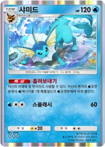 샤미드 | 특성: 흘려보내기 (자신의 차례에 몇 번이라도 사용할 수 있다. 자신의 벤치의 물 포켓몬에서 물 에너지를 1개 배틀필드의 물 포켓몬에게 바꿔 붙인다.) ⬛⬜⬜ 스플래시 (80) |