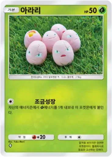 아라리 | ⬜ 조금성장 ※ 추가 효과: 자신의 에너지존에서 풀 에너지를 1개 내보내 이 포켓몬에게 붙인다. |