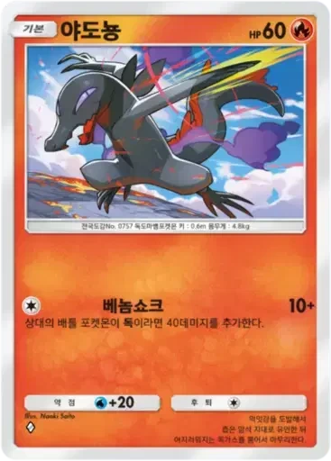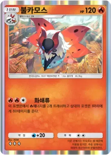 불카모스 | ⬛⬛⬜ 화쇄류 ※ 추가 효과: 이 포켓몬에서 불 에너지를 2개 트래쉬하고 상대의 포켓몬 1마리에게 80데미지를 준다. |