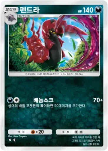 펜드라 | ⬛⬜ 베놈쇼크 (70+) ※ 추가 효과: 상대의 배틀 포켓모닝 독이라면 50데미지를 추가한다. |