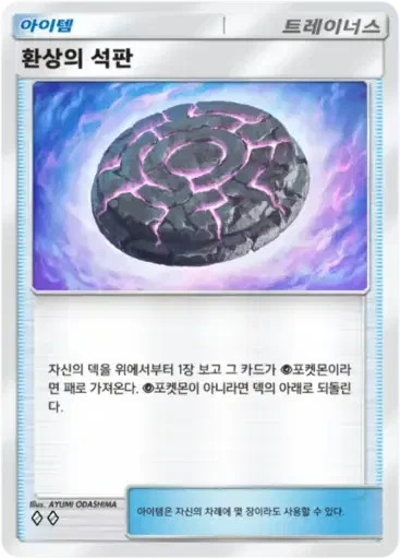 환상의 석판 | 자신의 덱을 위에서부터 1장 보고 그 카드가 에스퍼 포켓몬이라면 패로 가져온다. 에스퍼 포켓몬이 아니라면 덱의 아래로 되돌린다. |