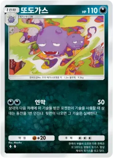 또도가스 | ⬛⬛ 연막 (50) ※ 추가 효과: 상대의 다음 차례에 이 기술을 받은 포켓몬이 기술을 사용할 때 상대는 동전을 1번 던진다. 뒷면이 나오면 그 기술은 실패한다. |