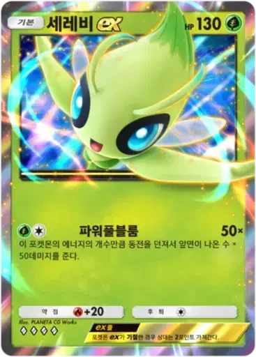 세레비 ex | ⬛⬜ 파워풀블룸 (50x) ※ 추가 효과: 이 포켓몬의 에너지의 개수만큼 동전을 던져서 앞면이 나온 수 x 50데미지를 준다. |