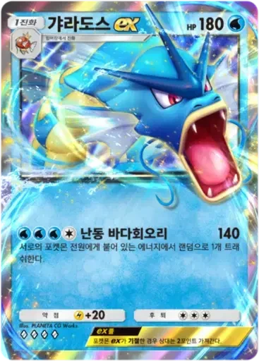 갸라도스 ex | ⬛⬛⬛⬜ 난동 바다회오리 (140) ※ 추가 효과: 서로의 포켓몬 전원에게 붙어 있는 에너지에서 랜덤으로 1개 트래쉬한다. |