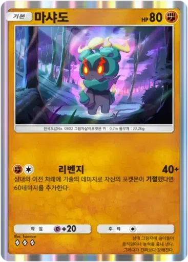마샤도 | ⬛⬜ 리벤지 (40+) ※ 추가 효과: 상대의 이전 차례에 기술 데미지로 자신의 포켓몬이 기절했다면 60데미지를 추가한다. |