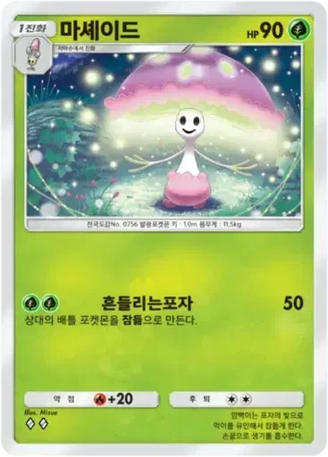 마셰이드 | ⬛⬛ 흔들리는포자 (50) ※ 추가 효과: 상대의 배틀 포켓몬을 잠듦으로 만든다. |