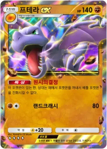 프테라 ex | 특성: 원시의결정 (이 포켓몬이 있는 한 상대는 패에서 포켓몬을 꺼내서 배틀 포켓몬을 진화시킬 수 없다.) ⬛⬜ 랜드크래시 (80) |