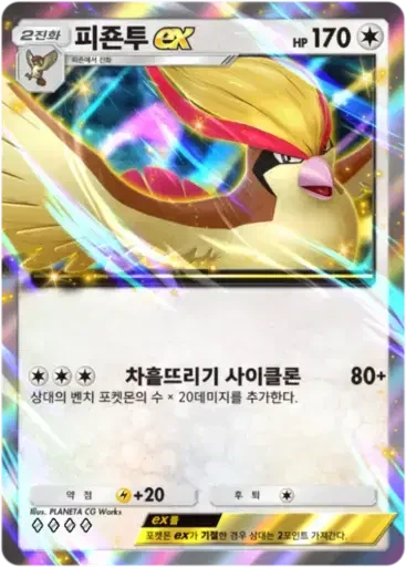 피죤투 ex | ⬜⬜⬜ 차흩뜨리기 사이클론 (80+) ※ 추가 효과: 상대의 벤치 포켓몬의 수 x 20데미지를 추가한다. |