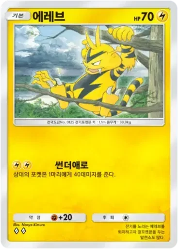 에레브 | ⬛⬛ 썬더애로 ※ 추가 효과: 상대의 포켓몬 1마리에게 40데미지를 준다. |