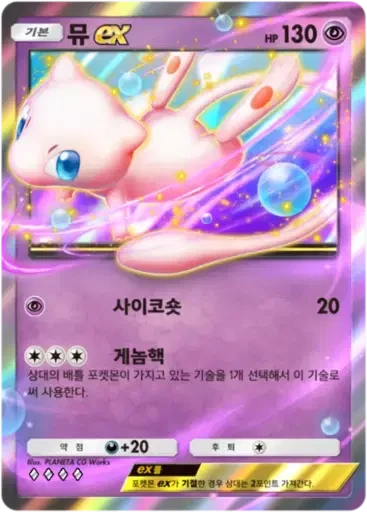 뮤 ex | ⬛ 사이코숏 (20) ⬜⬜⬜ 게놈핵 ※ 추가 효과: 상대의 배틀 포켓몬이 가지고 있는 기술을 1개 선택해서 이 기술로써 사용한다. |