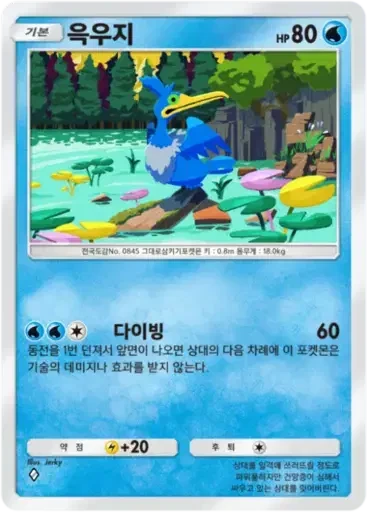 윽우지 | ⬛⬛⬜ 다이빙 (60) ※ 추가 효과: 동전을 1번 던져서 앞면이 나오면 상대의 다음 차례에 이 포켓몬은 기술의 데미지나 효과를 받지 않는다. |