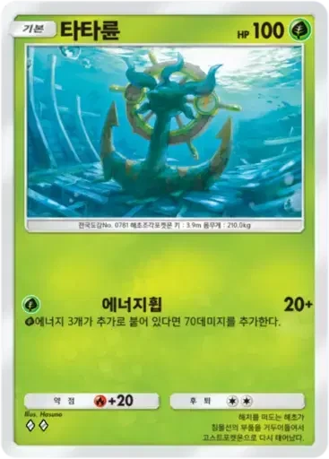 타타륜 | ⬛ 에너지휩 (20+) ※ 추가 효과: 풀 에너지 3개가 추가로 붙어 있다면 70 데미지를 추가한다. |