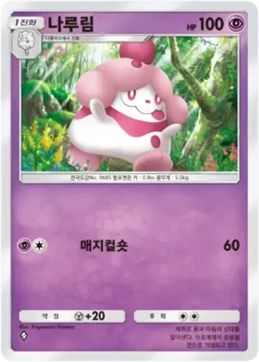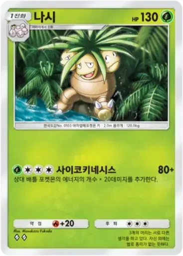 나시 | ⬛⬜⬜⬜ 사이코키네시스 (80+) ※ 추가 효과: 상대 배틀 포켓몬의 에너지의 개수 x 20 데미지를 추가한다. |