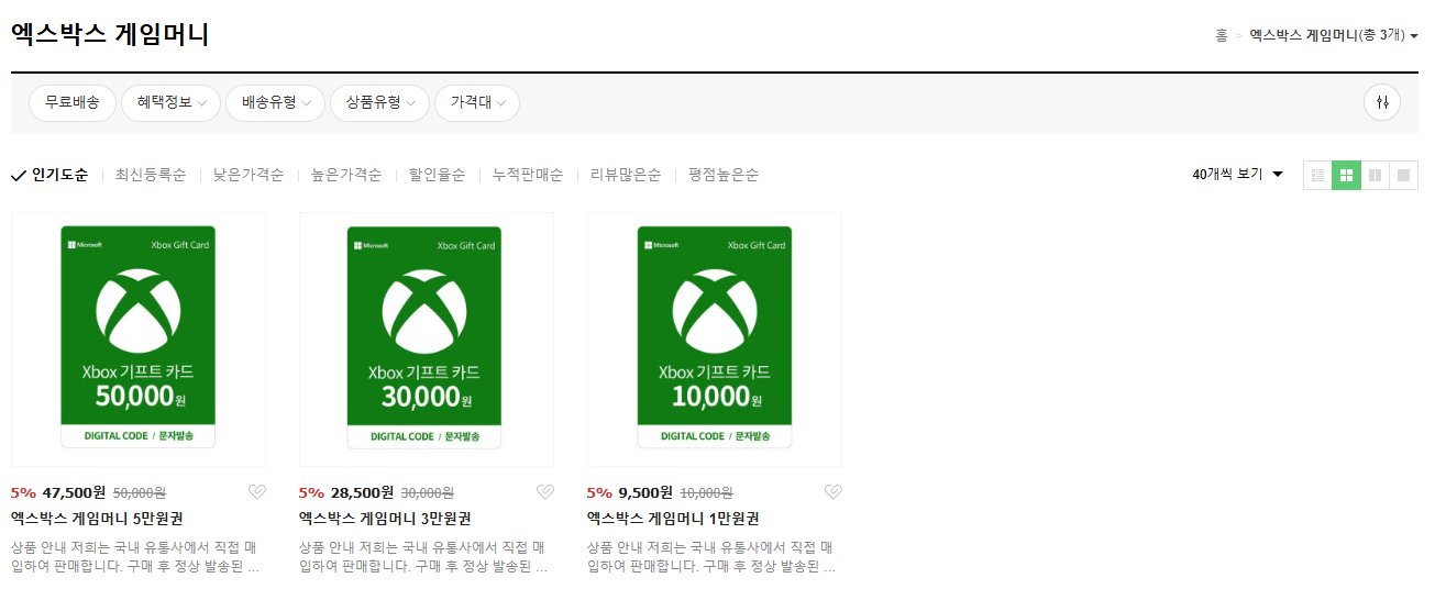 엑스박스 게임머니(엑스박스 기프트카드)를 할인하고 있는 스마트스토어 몰이 있다.
