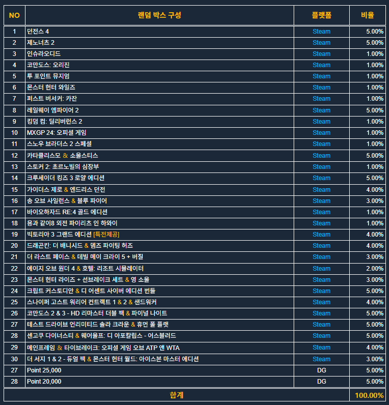 • 랜덤 박스로 제공되는 타이틀은 게임 본편만 제공되며, 특전은 제공되지 않습니다.