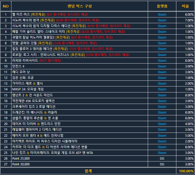 • 상품 페이지에 안내된 랜덤 박스 구성 중 1종이 랜덤으로 지급되며, 주문 완료 후 제품 코드(키) 활성화 시 타이틀을 확인할 수 있습니다.