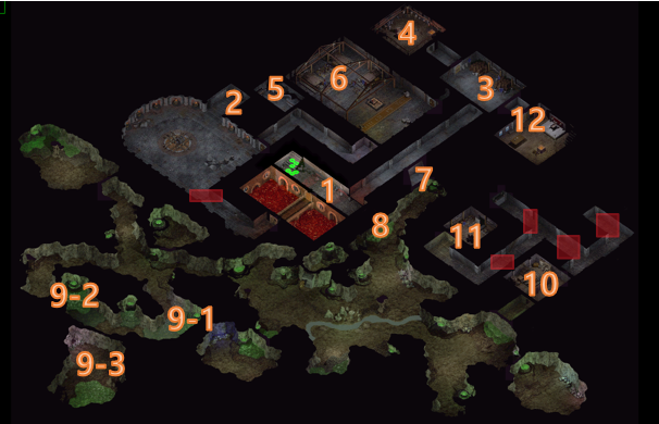 ※ 곳곳에 아이템(대부분 물약 및 화살)이 있으며 녹색 점액을 밟으면 데미지를 입으니 주의하자.