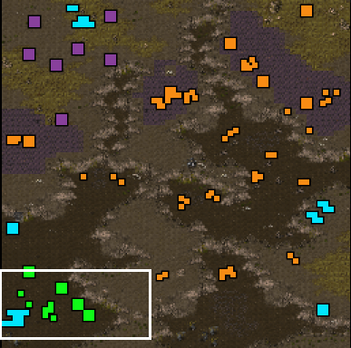 왼쪽 위에는 아군의 기지가 있다. 초반에 레이너를 이용하여 탐색하여 우리 편으로 만들자.