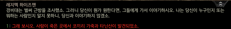 그리고 나서 다시 로즈 부케에게 대화를 걸면 참나무 껍질 냄새가 나는 범인이라는 단서를 얻고 그 단서가 곧 무두장이가 범인임을 알게 된다.