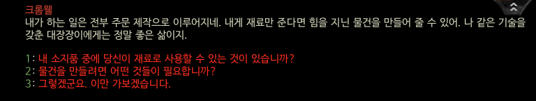 크롬웰은 여러 가지 장비를 만드는 일을 하고 있으며 여러 여행을 하면서 얻는 재료들로 조합을 할 수 있다.