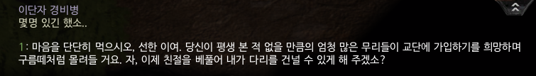 이단자의 사원 입구에서 경비병이 대화를 걸어온다.