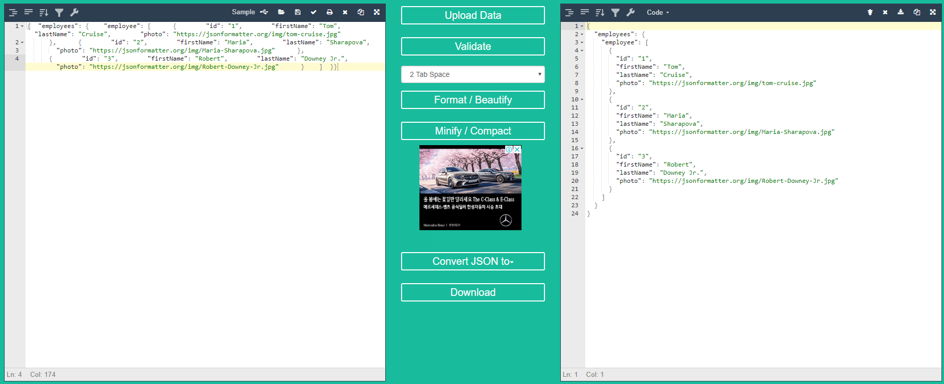 왼쪽에 형태가 엉망인 텍스트를 붙여넣고 중앙에 Format / Beautify 버튼을 누르면 오른쪽과 같이 개행 정리를 해준다.
