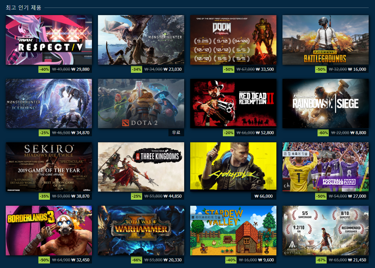 DJ MAX , 몬스터헌터 , 둠 이터널 , 레드 데드 리뎀션 2 등 몇 천가지의 게임이 할인 중이니 확인해보면 좋을 듯 하다.