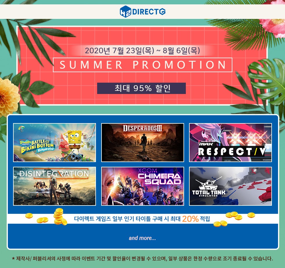 다이렉트 게임즈에서 8월 6일까지 2020 여름 할인 프로모션을 진행하고 있다.