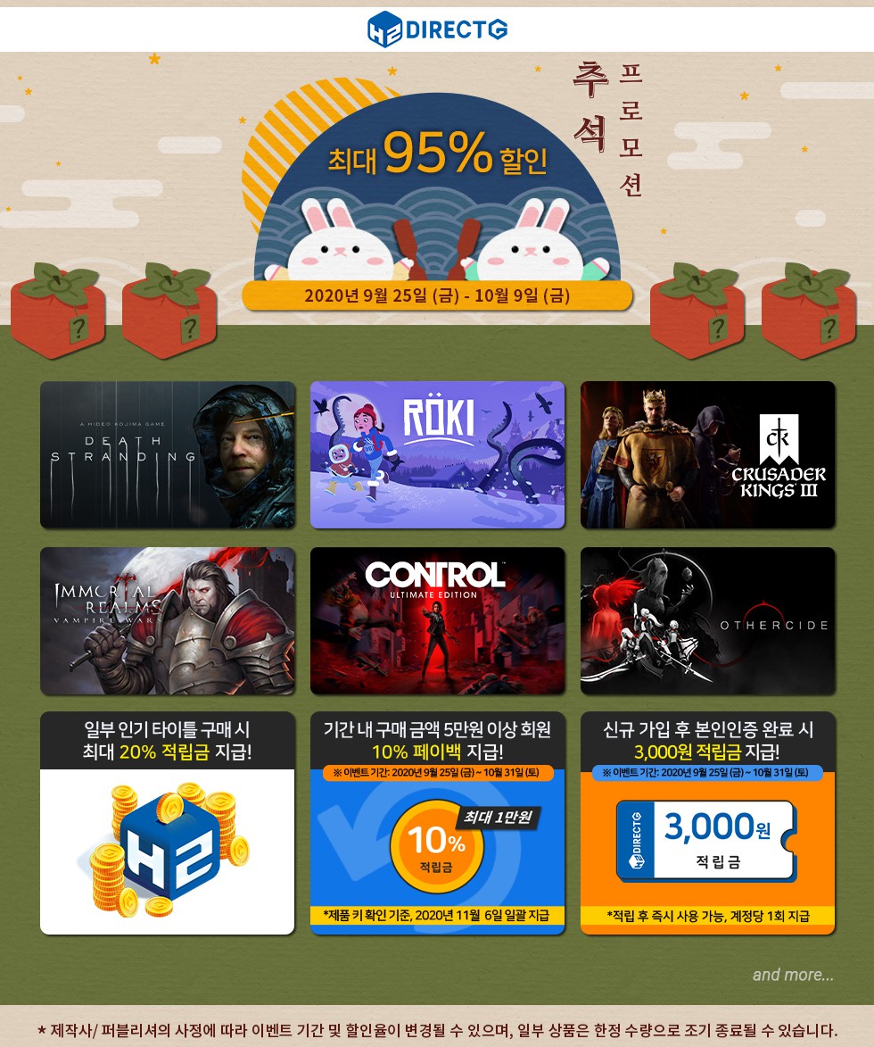 다이렉트 게임즈에서 10월 9일까지 추석 할인 프로모션을 진행하고 있다.