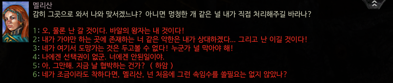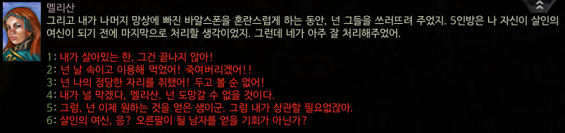 멜리산의 대화 중 다음 선택지에 따라 엔딩의 결과가 바뀔 수 있다.