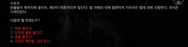 그럼 수호자가 대화를 걸어올 것이다. 대화는 다음과 같이 선택하면 된다.