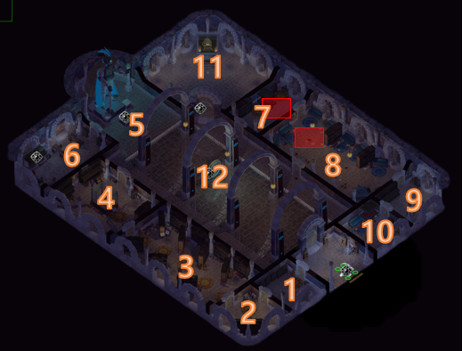 | 상자 (함정 / 잠김) - x=778,y=1200 | 고급 치유의 물약 , 봉인된 존재의 내력 (책) , 탄환+3 , 사슬갑옷+2 , 진홍의 다트+3 (투척 후 사용자 손으로 돌아옴) |