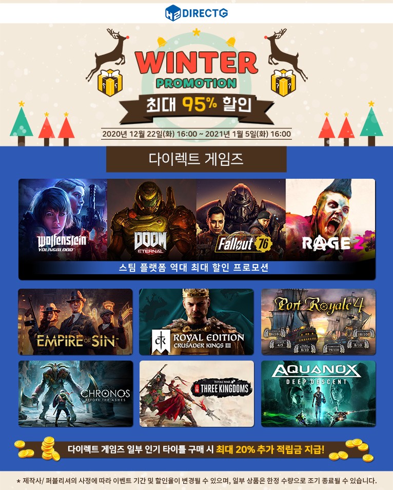 | [~2021년 1월 5일] 다이렉트 게임즈 2020 겨울 프로모션 & 감사 이벤트 (0) | 2020.12.22 |