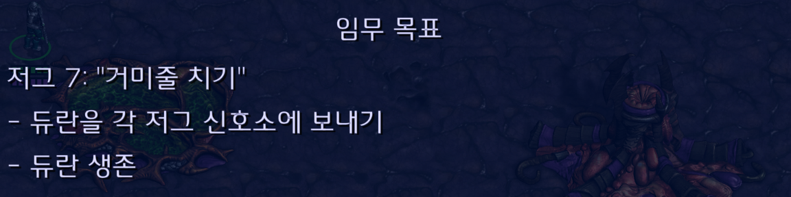 파란색 끝 부분 5개의 저그 신호소에 듀란을 데려가면 승리하는 미션이다.