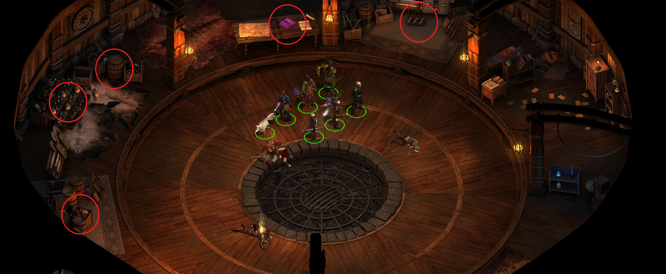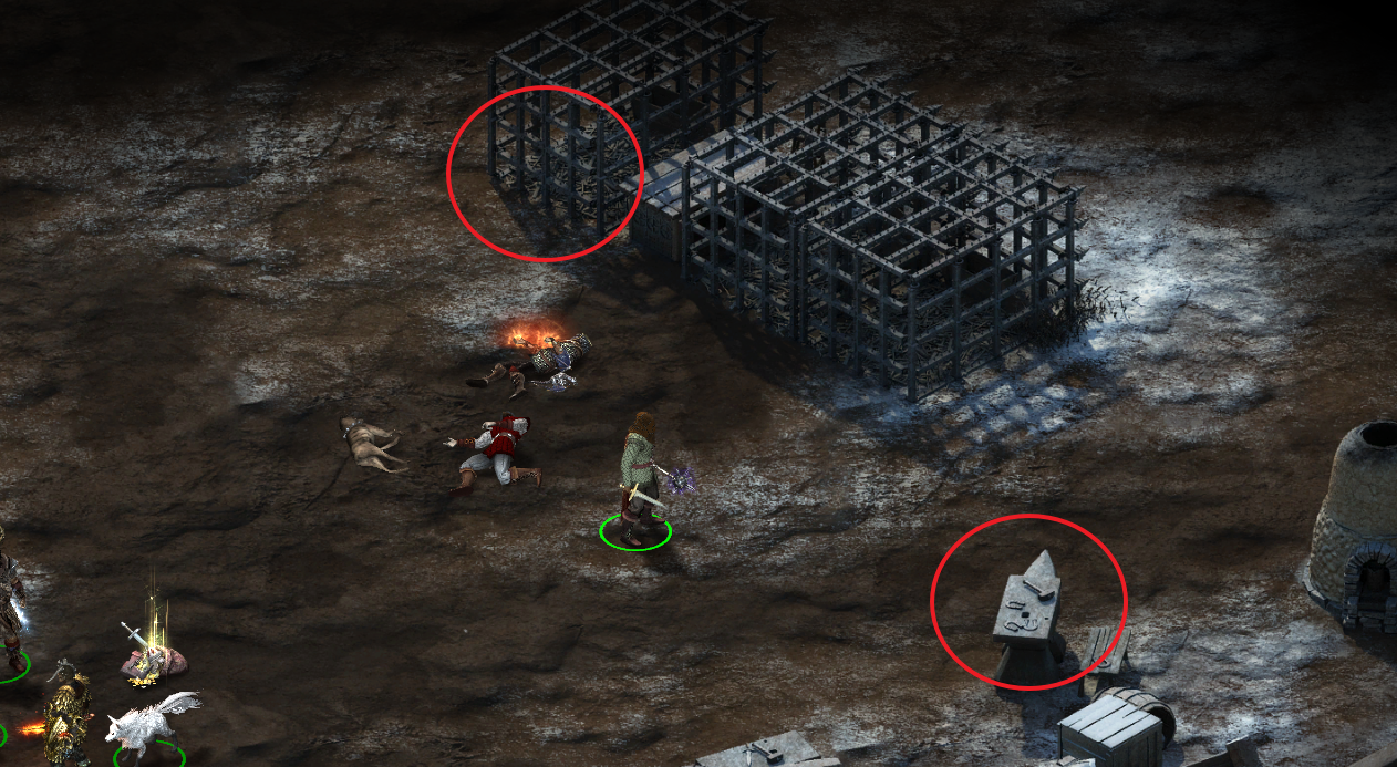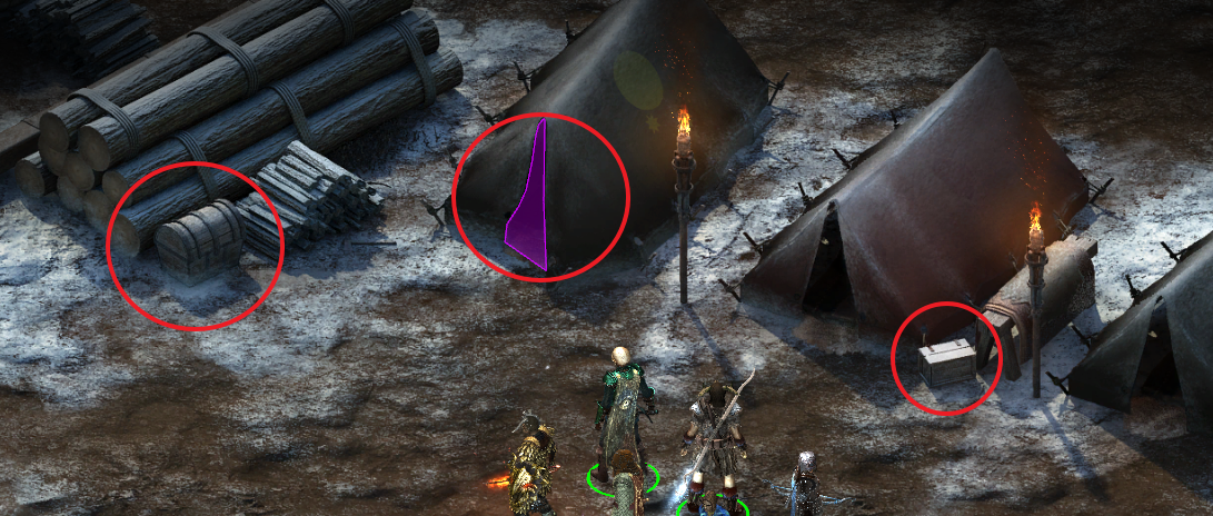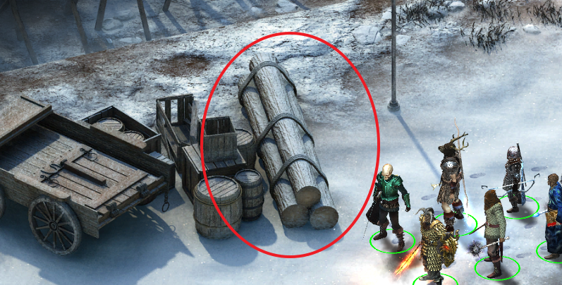 - 아래 통나무(지도 2번 표시)를 이용해 정문을 부술 수 있다. (단 일행이 부상을 입는다.)