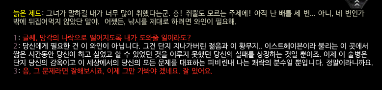 집 안에 들어가서 제드와 이야기해보면 와인 한 병 사서 가져다줄 수 있는지 일행에게 물어본다.