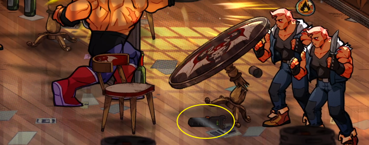 전기 충격기는 오른쪽에 헬멧 쓴 박치기하는 적이 나타나는 곳에서 테이블을 부술 때 발견할 수 있다.