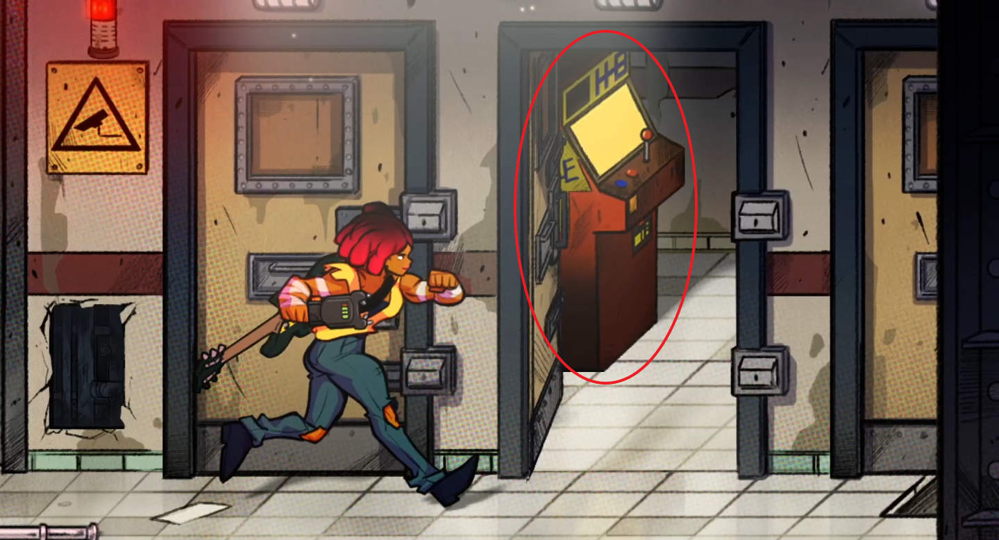 스테이지 진행 중에 아케이드 게임기와 전기 충격기가 있으면 체험이 가능한데