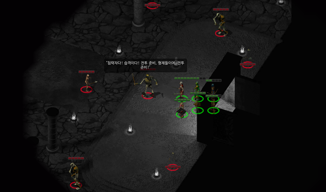 가운데 구역에는 불화살을 쏘는 해골 궁수와 더불어 마법사까지 공격을 해오므로 돌진에 주의해야 한다.