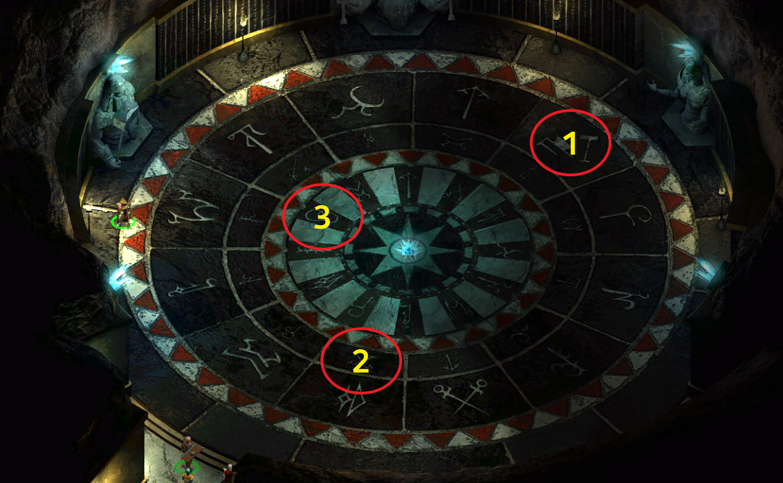 퍼즐 방에 들어가보면 바닥에 위와 같은 문양이 있는데 잘못 밟는 경우 번개 마법이 떨어져 일행이 피해를 입는다.