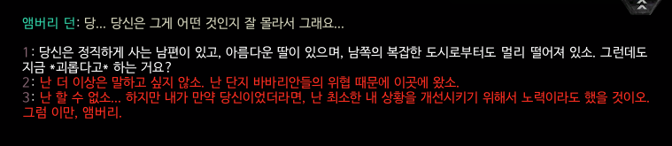 엠버리 던과 대화를 하다가 위의 선택을 하게 되면 엠버리는 가정에 최선을 다할 수 있도록 설득할 수 있을 것이다.