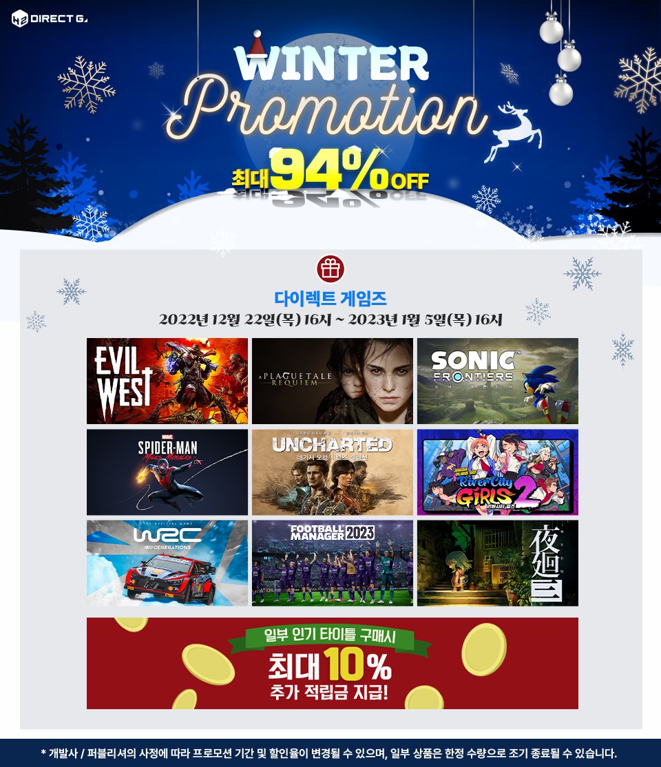 | [~2022년 12월 5일] 다이렉트 게임즈 2022 블랙 프라이데이 프로모션 (0) | 2022.11.24 |