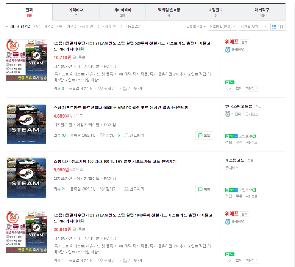 스마트스토어에는 다양한 외국 화폐의 스팀월렛코드를 판매하고 있다.