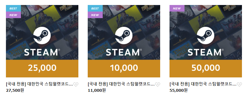 세 종류의 스팀월렛코드를 판매하고 있으며 단점이라면 충전 금액보다 10% 비싸다.