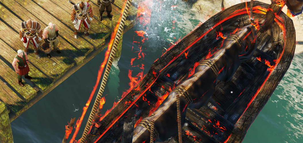 항구 아래쪽에 불타고 있는 배를 발견할 수 있다.