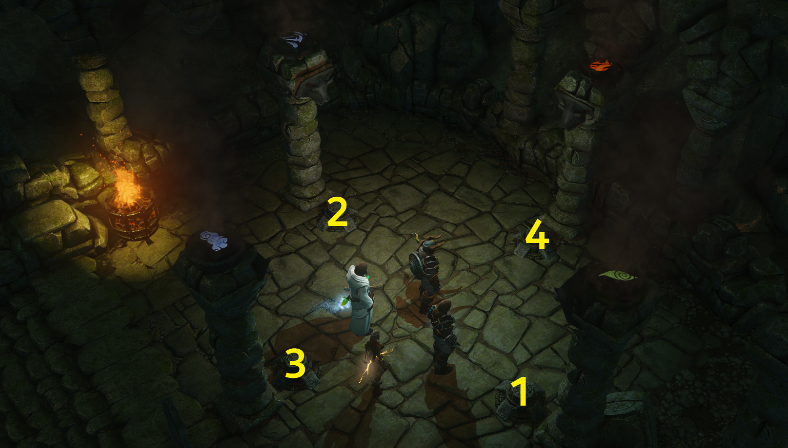 물 → 대지 → 공기 → 화염 순으로 발판을 누르면 되며 마찬가지로 올바르게 작동시 반대편 입구에 신비한 적이 있다.