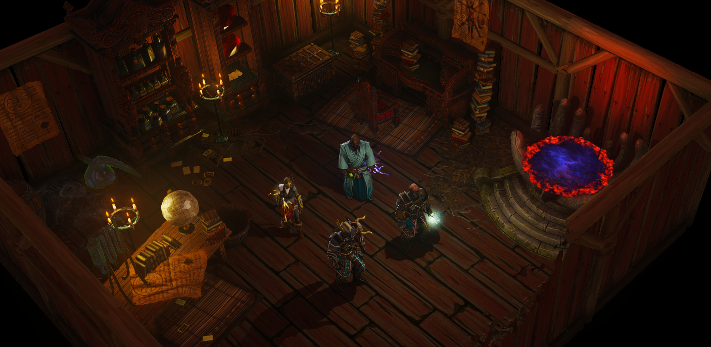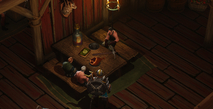 원형 테이블에 앉아 있는 3명은 물약, 재료 등 다양한 아이템들을 판매하고 있다.